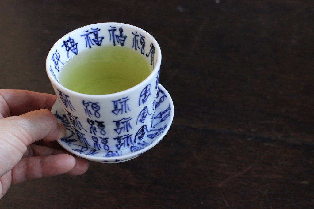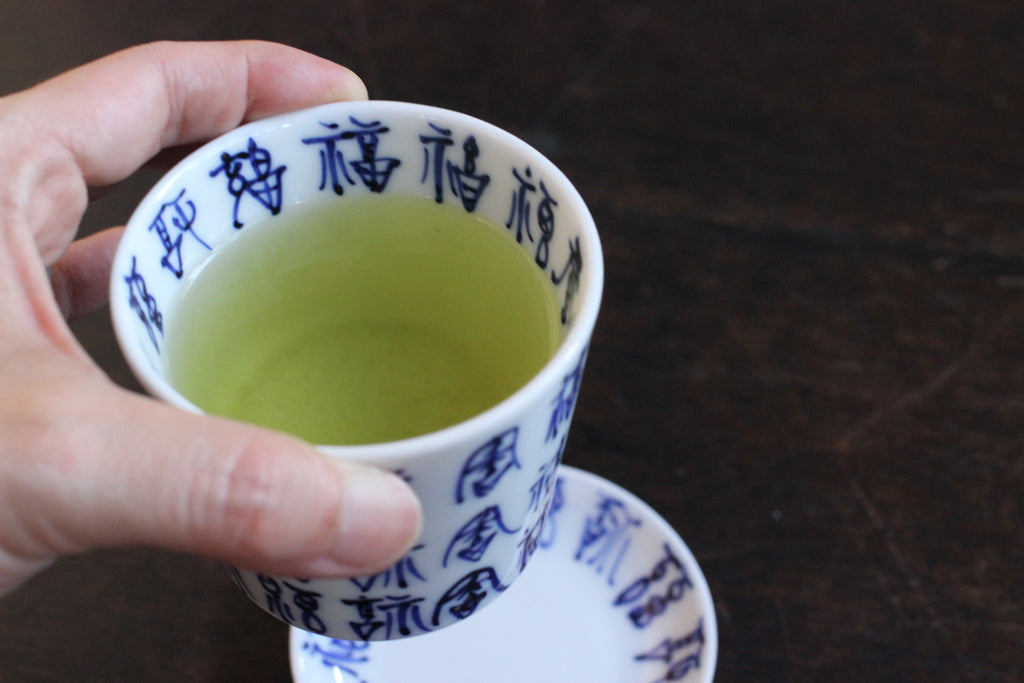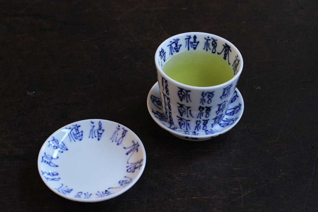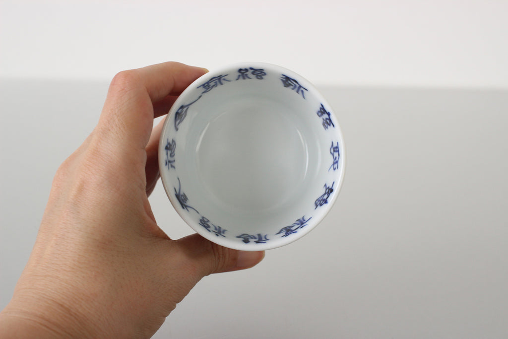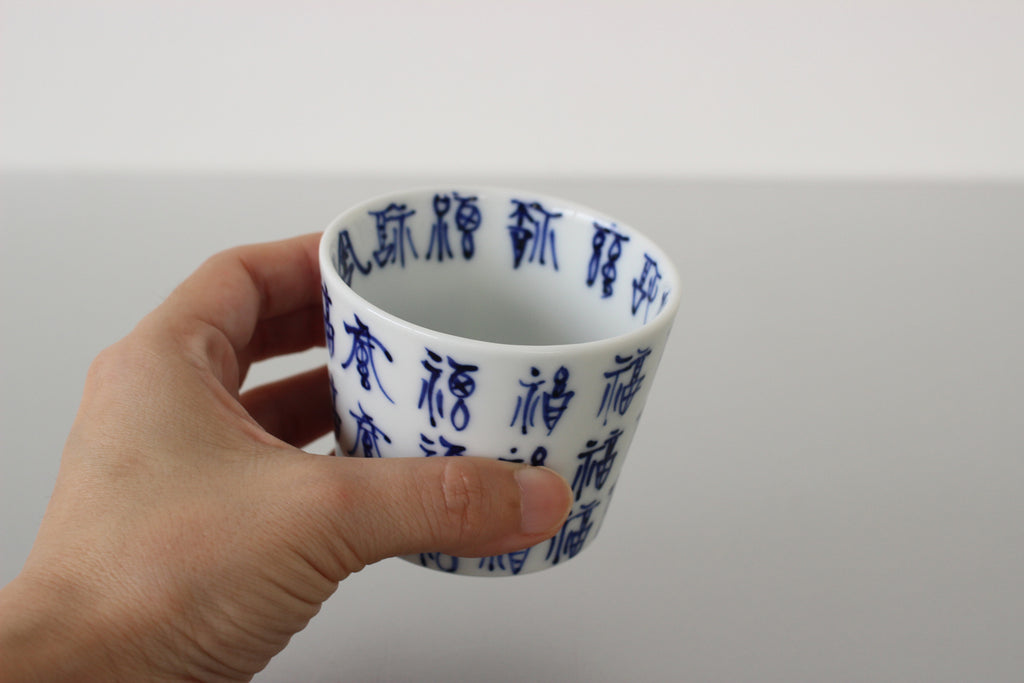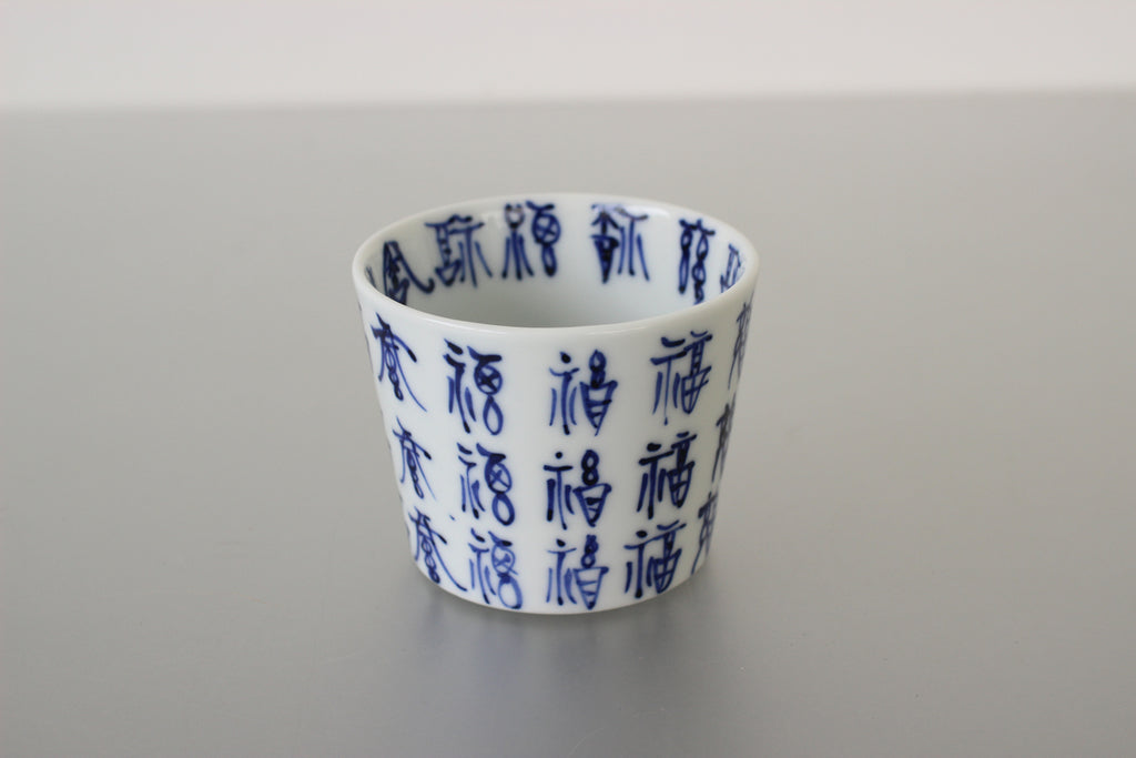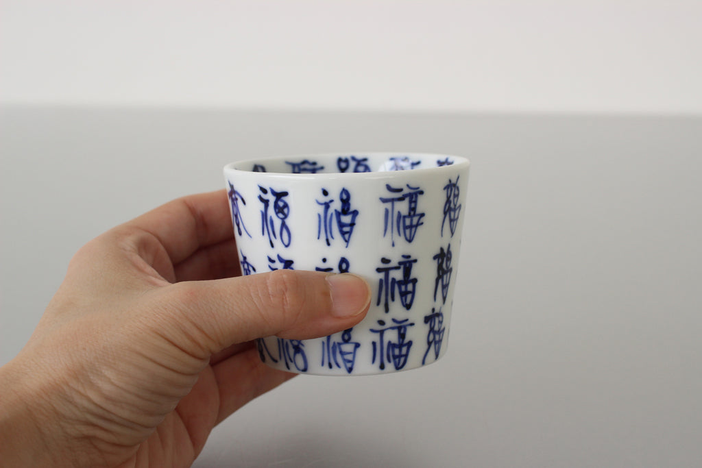 日本三大焼き物のひとつ愛知県の「瀬戸」。4代目を継ぐ老舗の窯元「眞窯(シンガマ)」さんで作られた福文字が描かれたそば猪口。別途小皿がありますので、そば猪口とセットでお祝いの贈り物にするのもおすすめです。美しい白地に青の手描きの福文字が並ぶシリーズ。