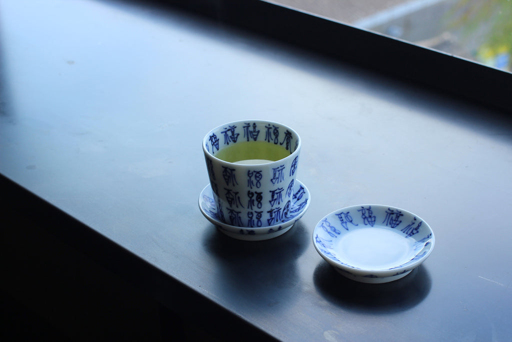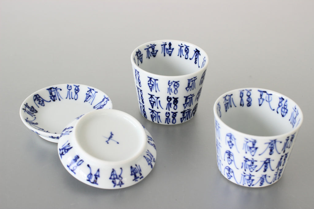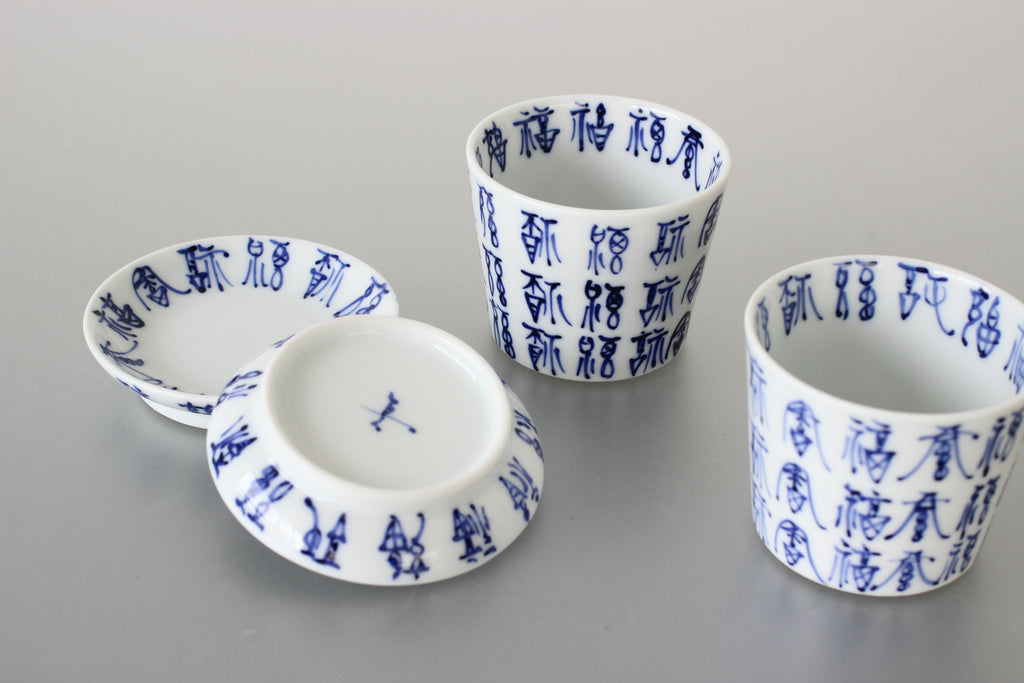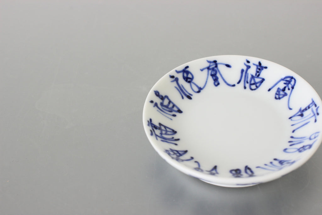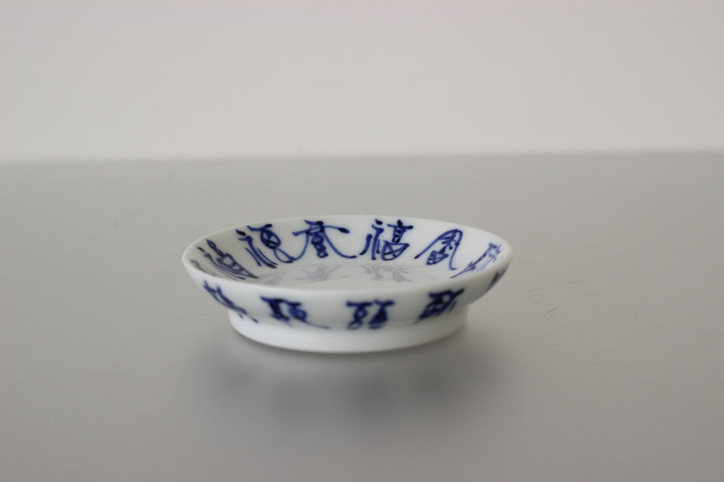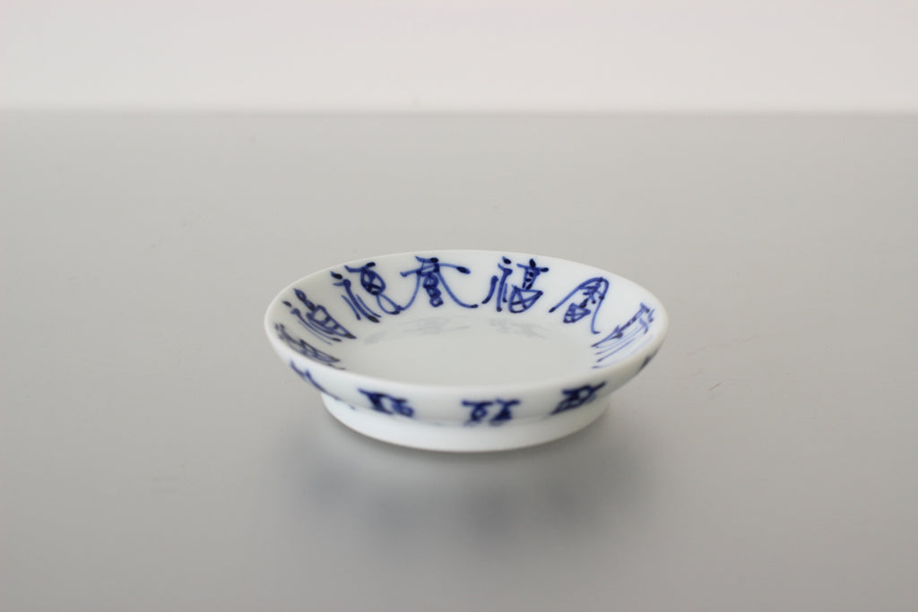 日本三大焼き物のひとつ愛知県の「瀬戸」。4代目を継ぐ老舗の窯元「眞窯(シンガマ)」さんで作られた福文字が描かれた小皿です。そばちょこの受け皿として、お醤油やお菓子のお皿としても使いやすい丸皿。美しい白地に青の手描きの福が並ぶお祝いのお皿です。