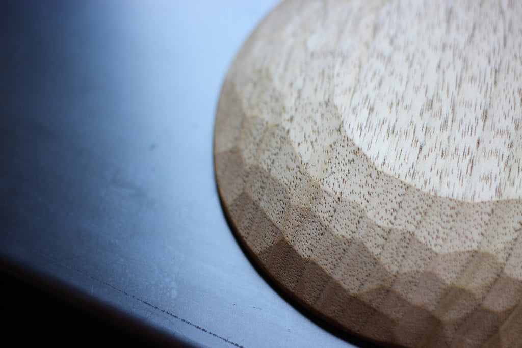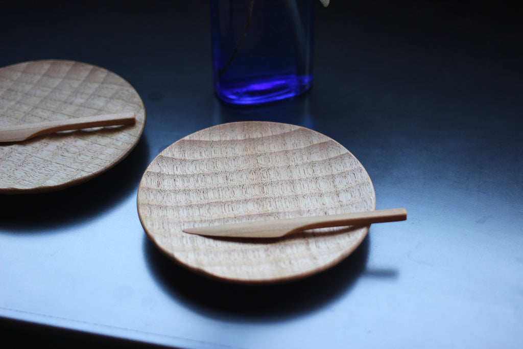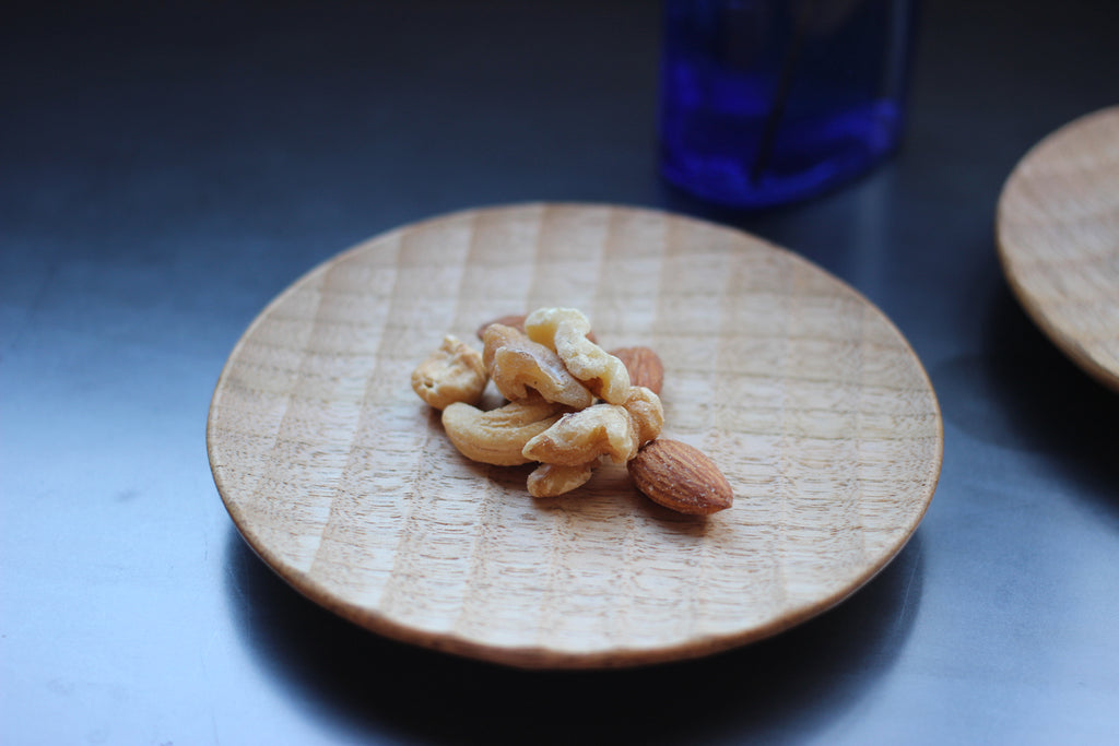 美しい彫りが特徴の加賀雅之さんが手仕事の跡をわざと残し、荒い削りや丸みで表情を持たせたプレート。試作段階で彫りを入れるかそのままで行くか迷ったそうですが、いつもとは表情を変えて人の手が作り出す愛嬌をそのまま作品に落とし込んだプレートです。温かい食卓に添えたい小皿になりました。