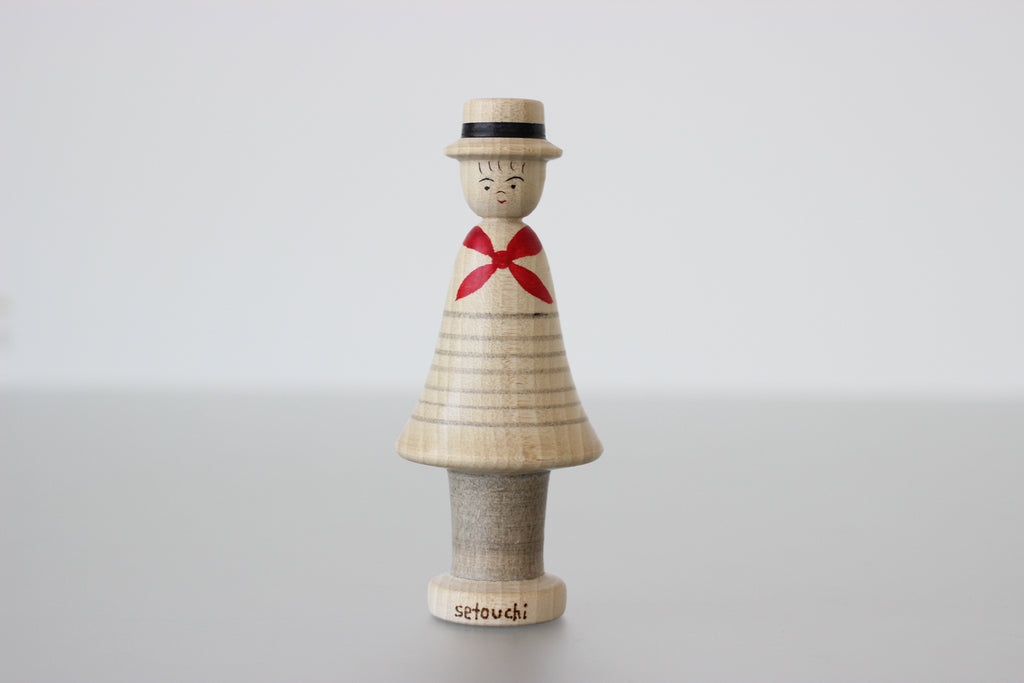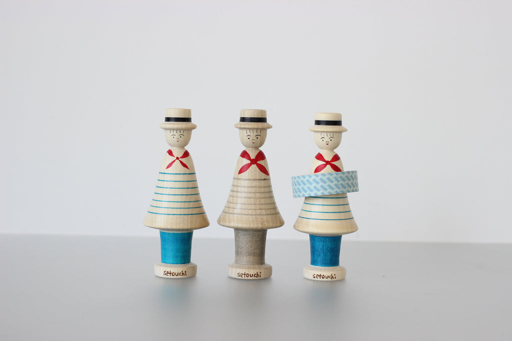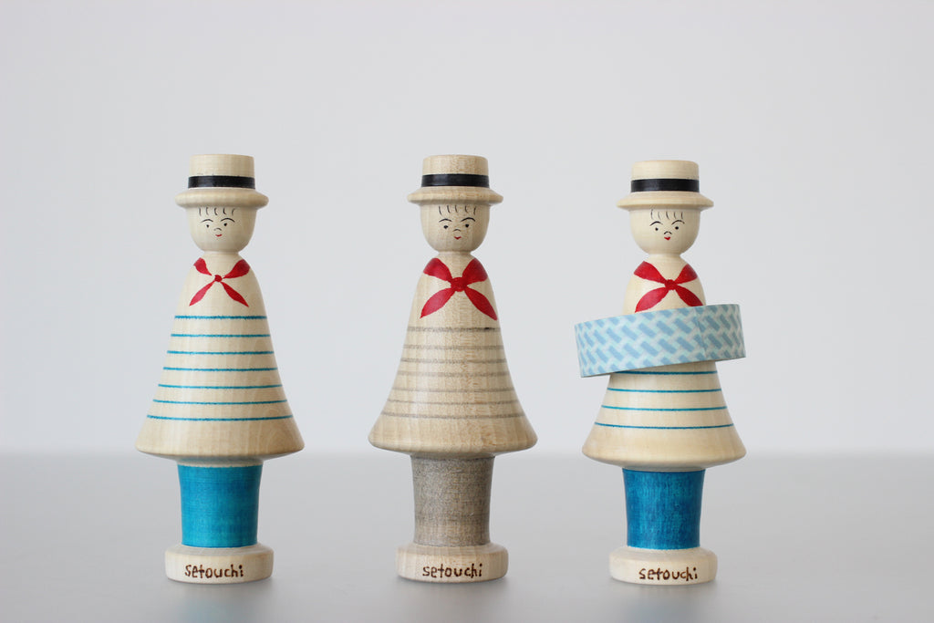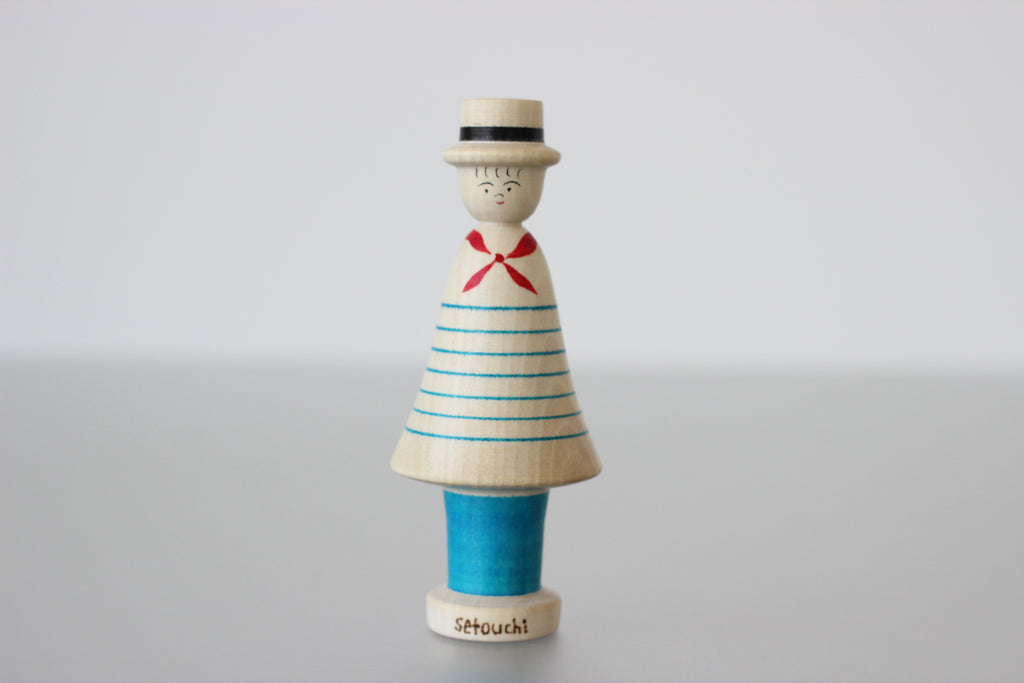 麦わら帽子をかぶって港町をお散歩するマリンルックのこけしちゃん。海辺の街「北浜アリー」らしさのあるこけしを…とお願いして作ってもらいました。一緒に海辺の旅を楽しんでもらえますように♪