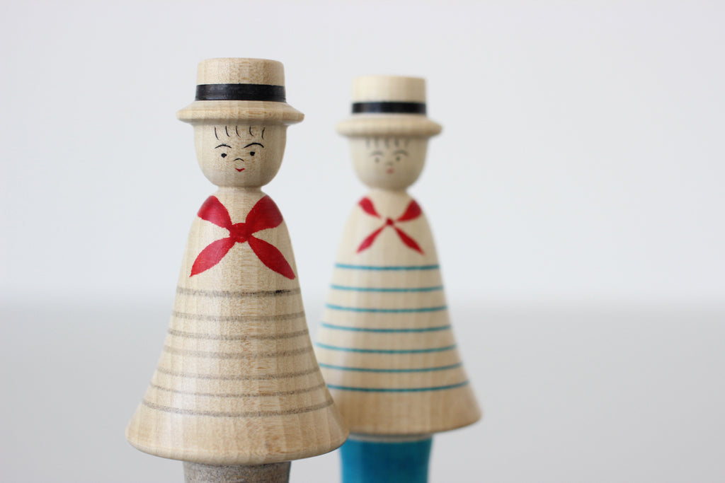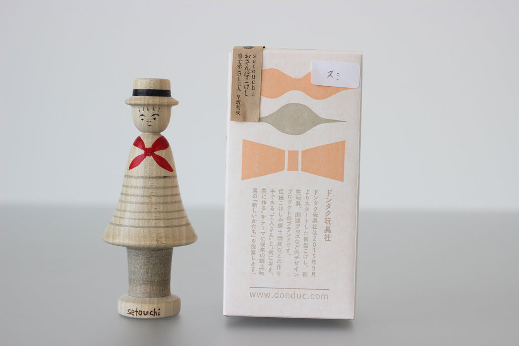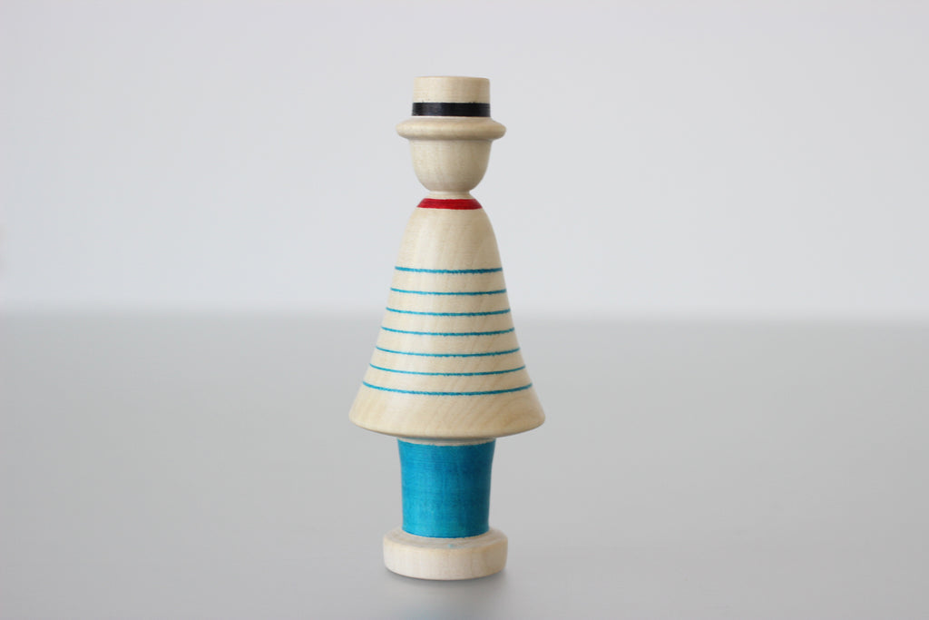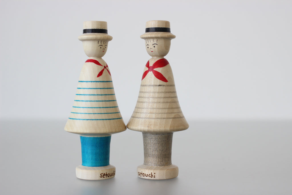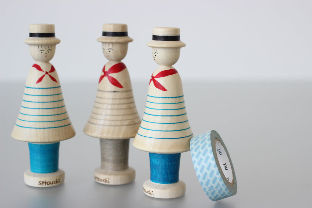 麦わら帽子をかぶって港町をお散歩するマリンルックのこけしちゃん。海辺の街「北浜アリー」らしさのあるこけしを…とお願いして作ってもらいました。一緒に海辺の旅を楽しんでもらえますように♪