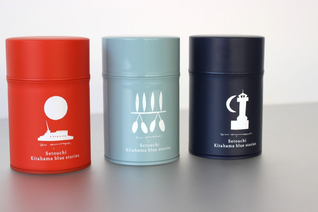 せとうちの夕暮れをイメージしたオレンジベースの「船」、月夜に浮かび上がる深いブルーの「灯台」はマットで落ち着いた印象に、優しい色合いの「オリーブ」は光沢あるタイプ。前回も人気だったブリキ缶は今回シックに棚に置いておくだけでも様になるように仕上げました。