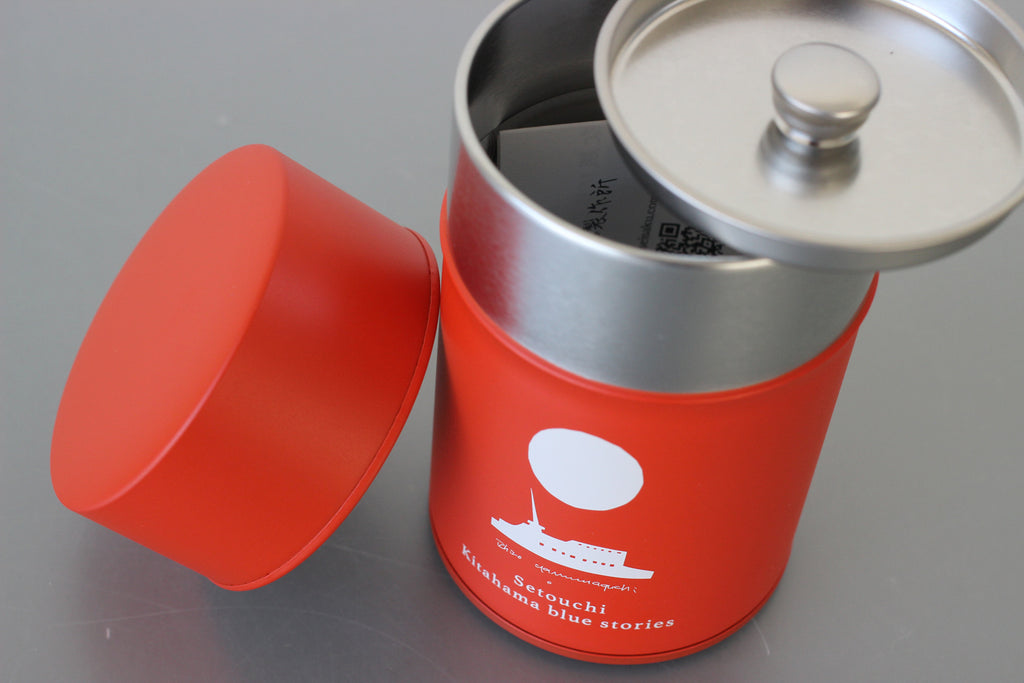 イラストは山口一郎さんが切り絵で描いた瀬戸内たち、本体の缶は日本のメーカーさんが昔ながらの製法で一つ一つ丁寧に加工するブリキ缶、仕上がりも美しく使い勝手が良いように中蓋付きです。