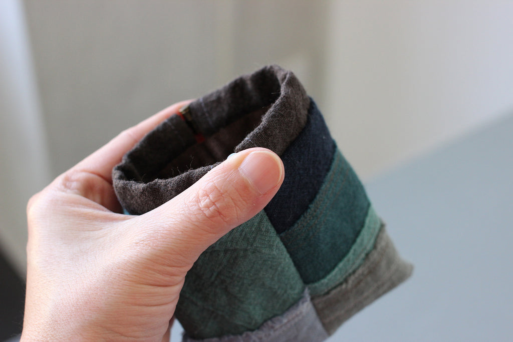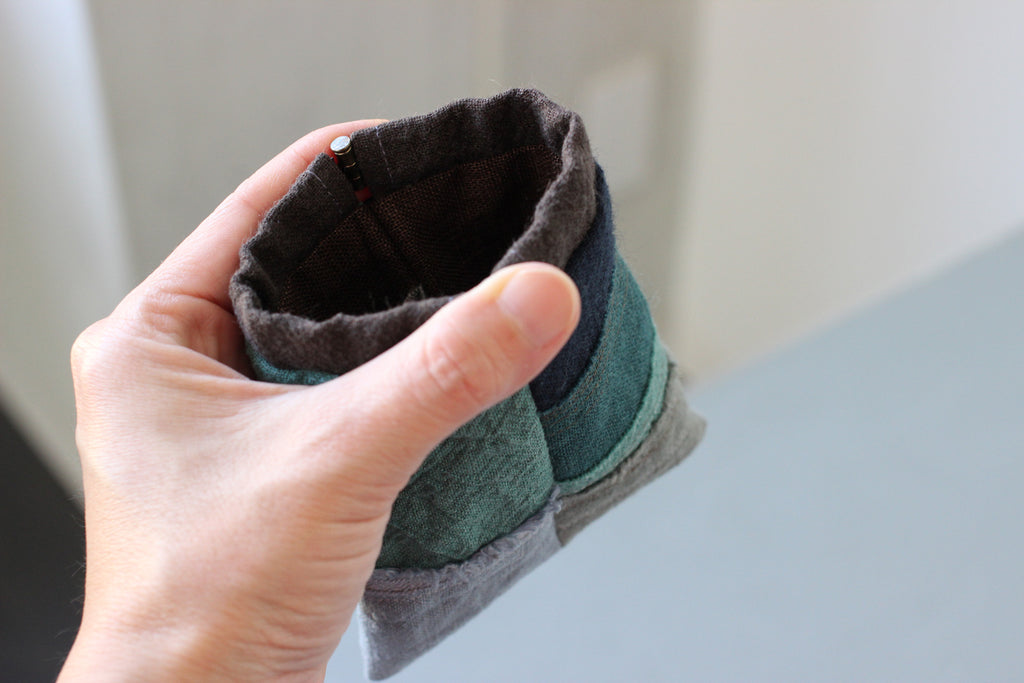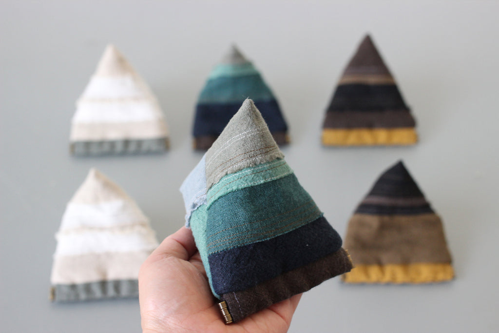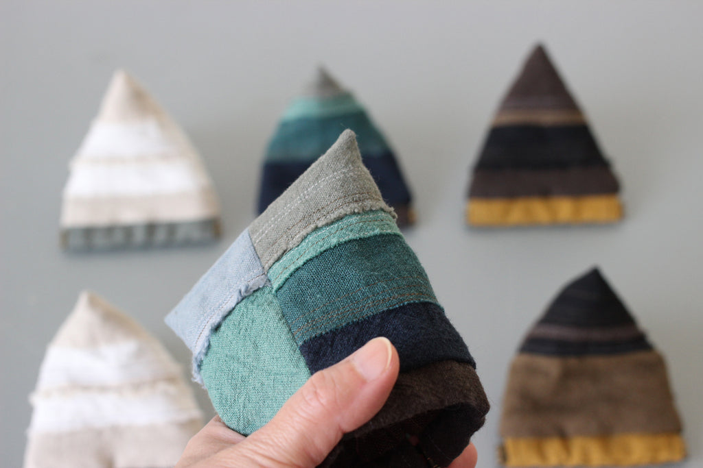 片手でぱかっと開ける三角のポーチは旅先で飴ちゃん入れたり、リップや鍵を入れて。ウキウキする楽しそうな形になりました。浜辺を歩きリセットする大切な時間を縫い上げて、いつでも美しい景色が楽しめるようにと願いが込められたポーチです。
