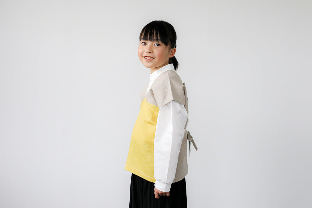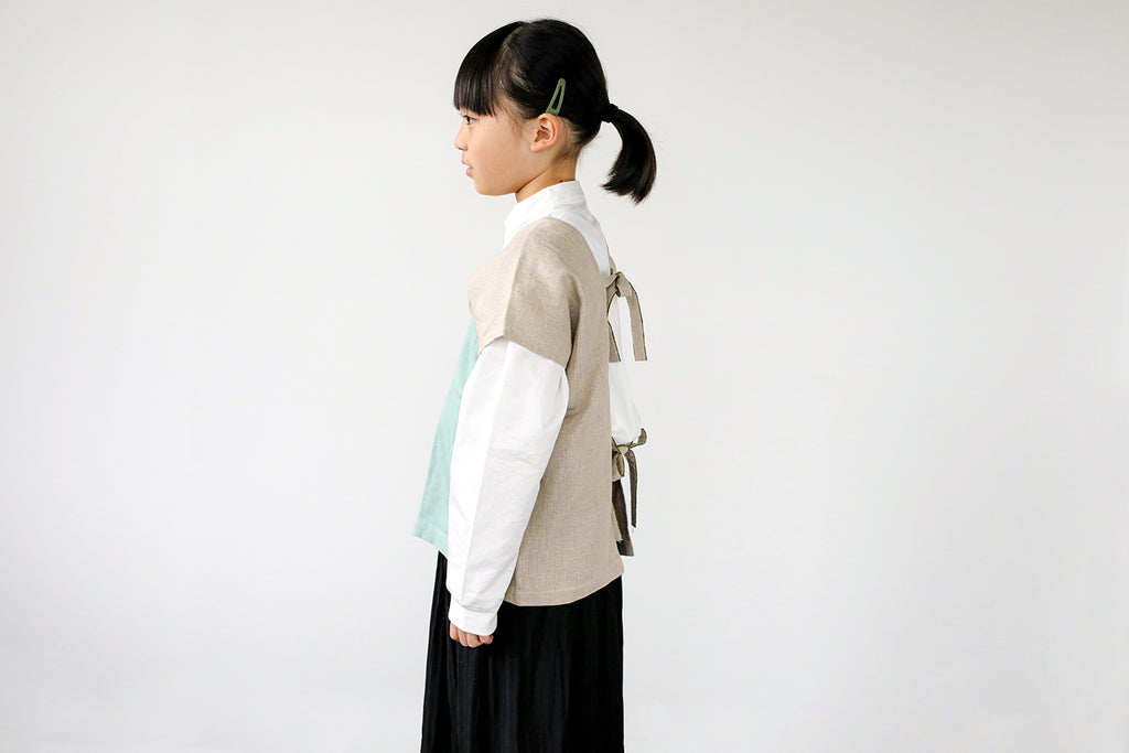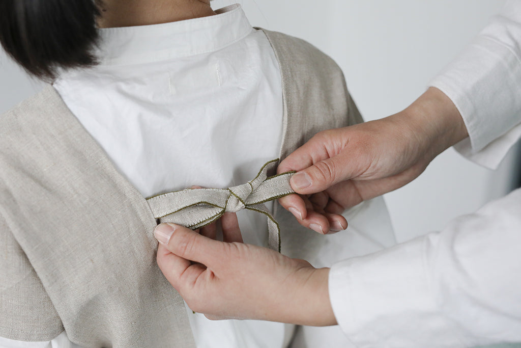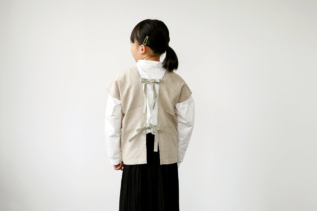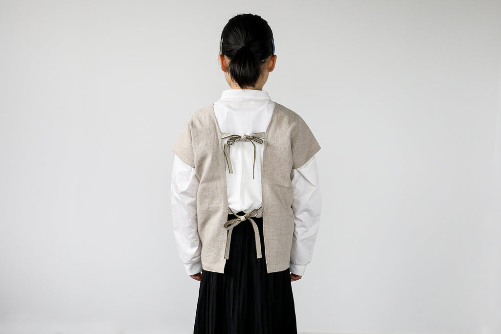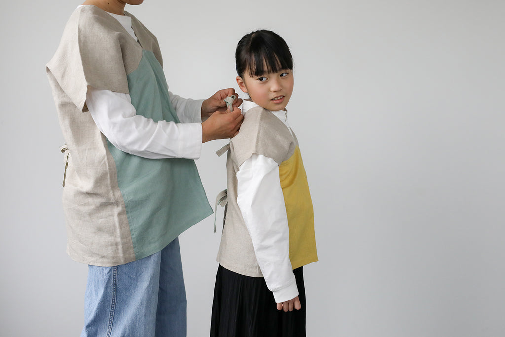 ボタンがないので、後ろでリボンを結んですっぽりと被れば身軽に動けます。
