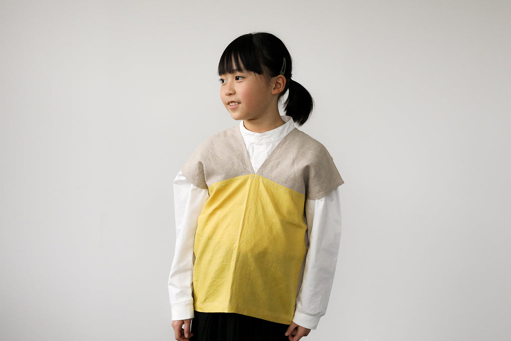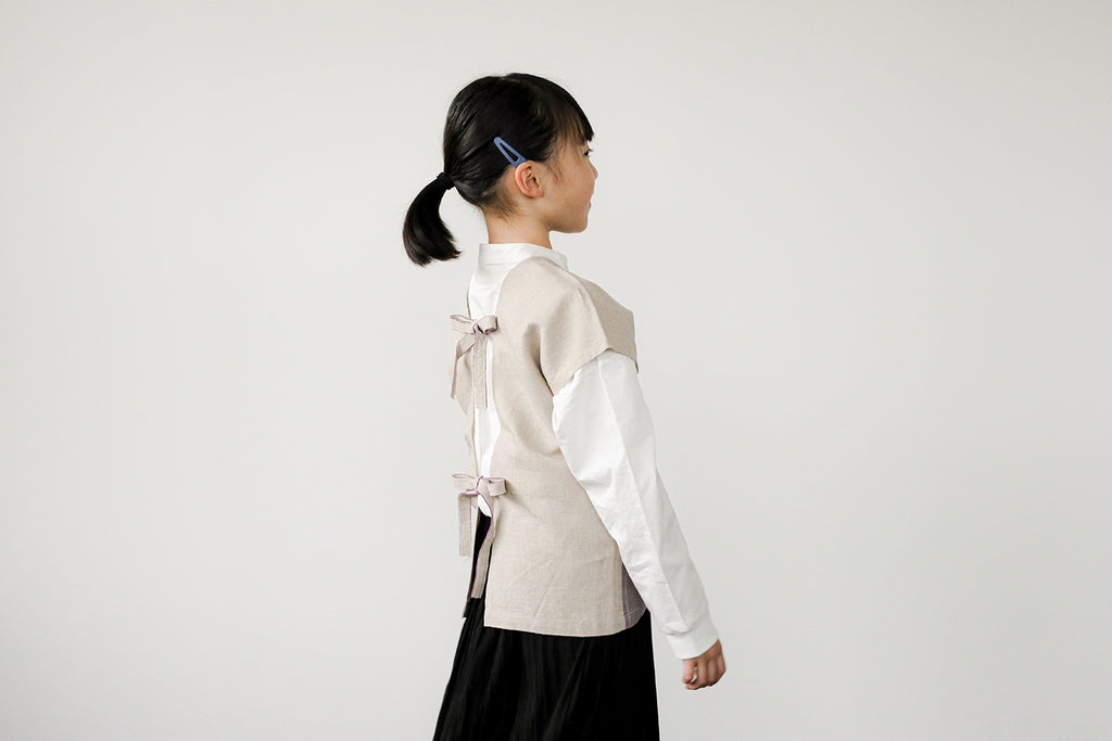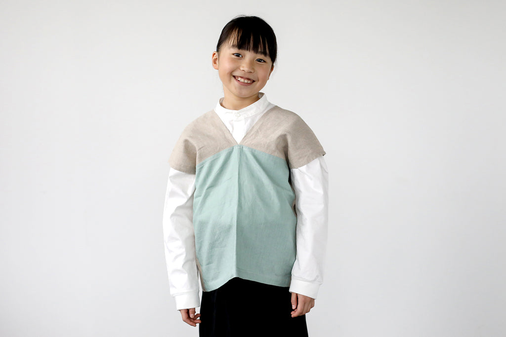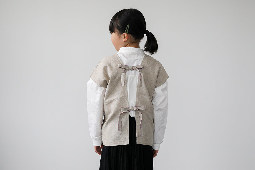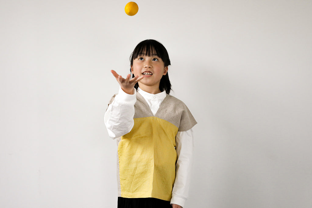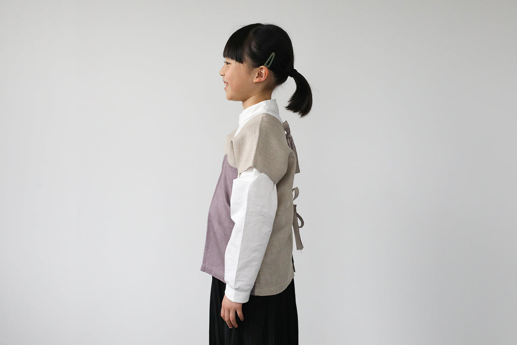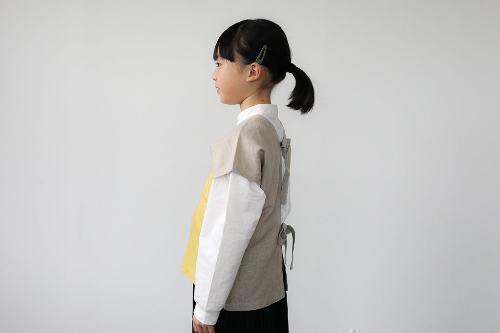 ボタンがないので、後ろでリボンを結んですっぽりと被れば身軽に動けます。