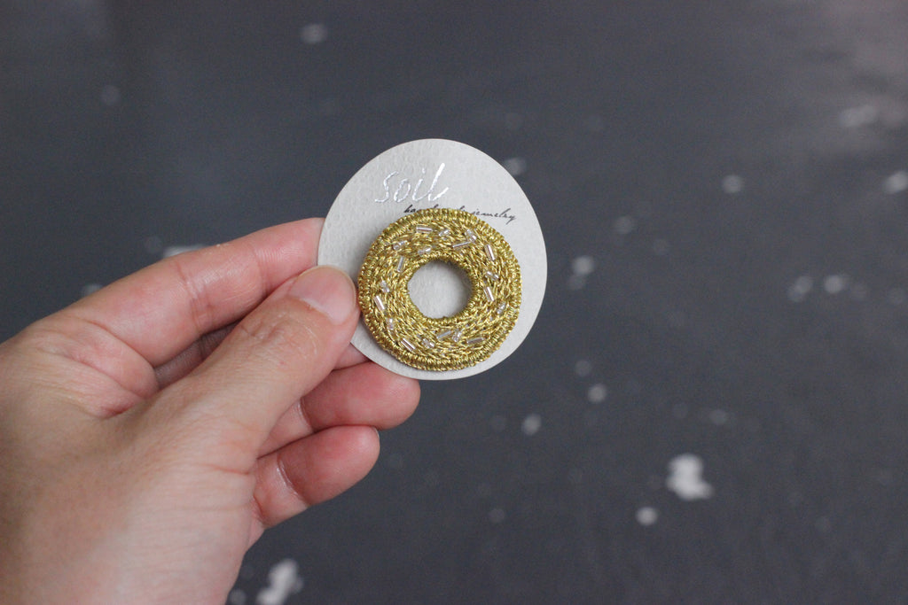 一針一針縫い上げて美しい手仕事が仕上がる刺繍。カジュアルな時も大切な式典の時も女性らしく輝かせてくれる美しく凛としたsoilさんのブローチです。