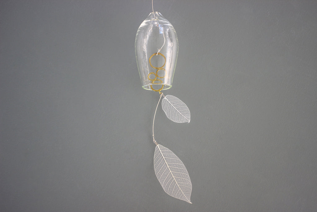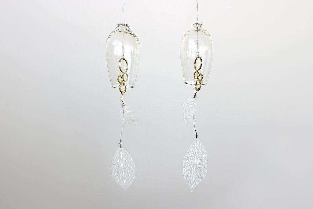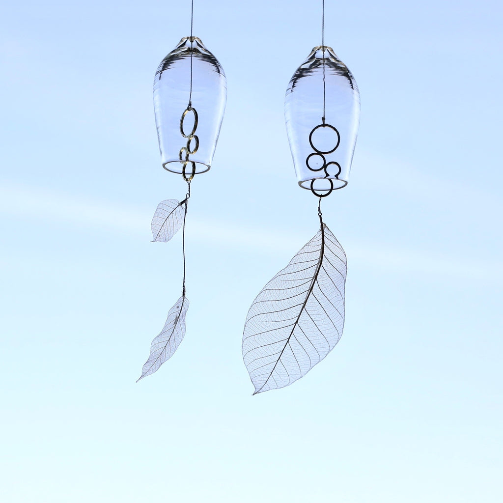 吹きガラスと真鍮の風鈴。夏のいい音がします。透明感の高いガラスに 自然のモチーフを付けた風受け、 真鍮の舌が心地いい音色を鳴らします。美しさと愛らしさがあるとりもとさんの風鈴です。贈り物にもおすすめです。