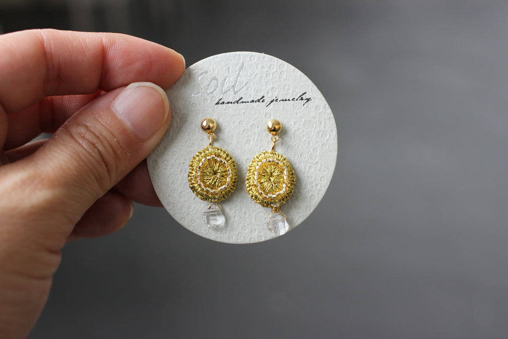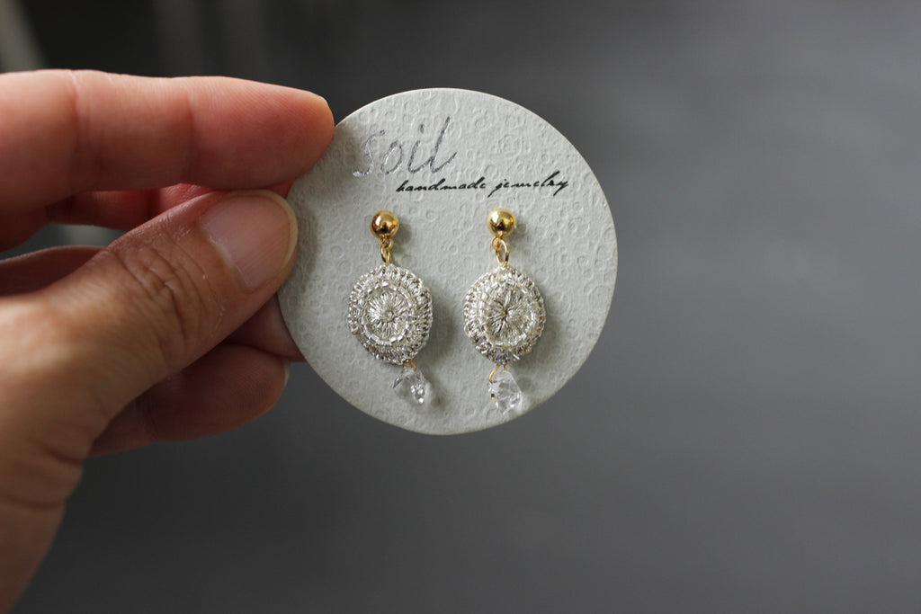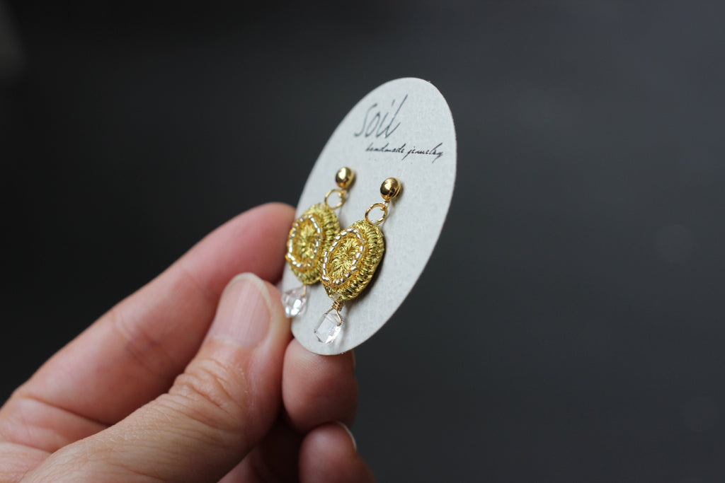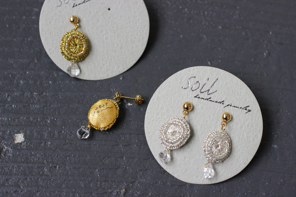 朝露がキラリと輝く草花をイメージしたそう。ゆらゆらと輝きが放って可憐な美しさが漂います。全て手仕事で仕上げられるsoilさんの作品はキラリと光る糸を使ってパッと顔を華やかに彩ってくれます。お出かけを楽しくさせてくれるアクセサリーです。
