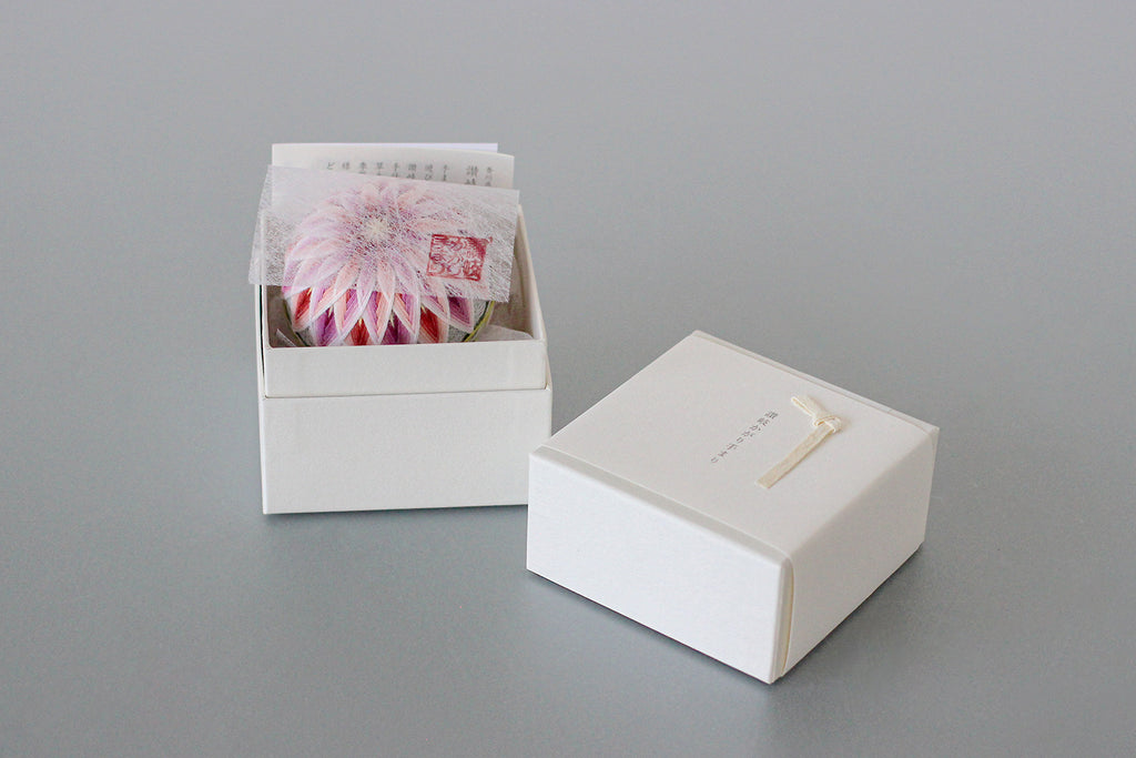 白い熨斗を付けた白い紙箱に入れてお届けします。