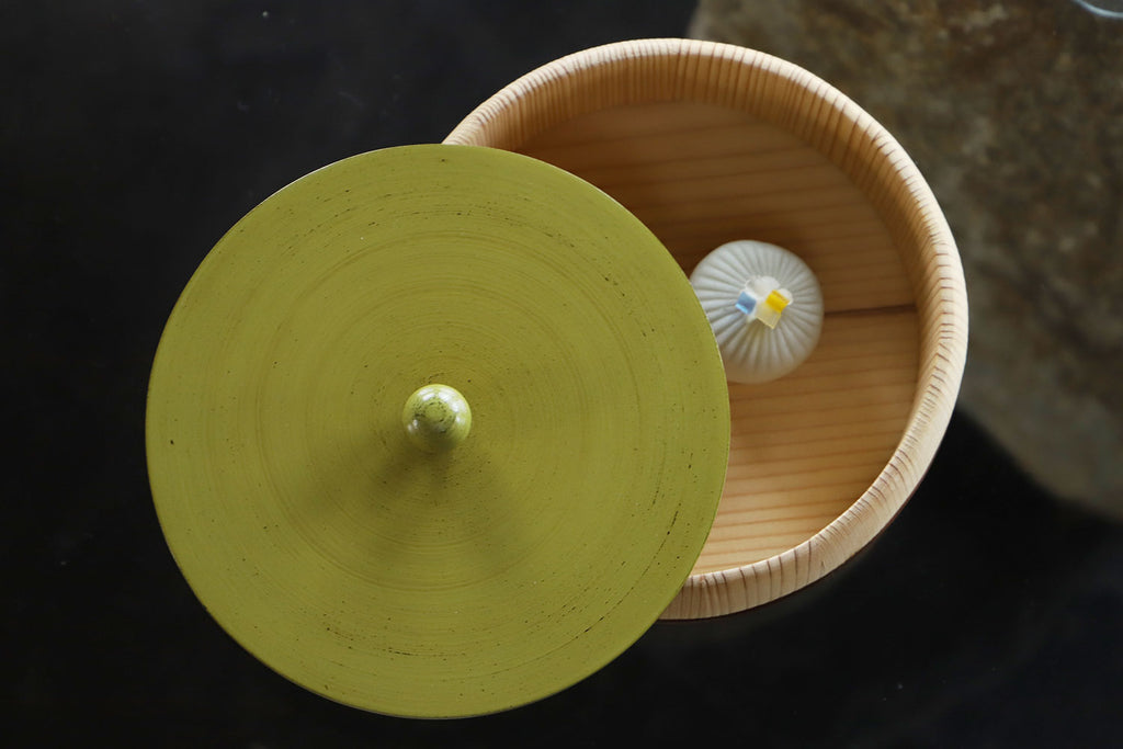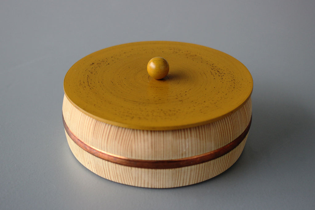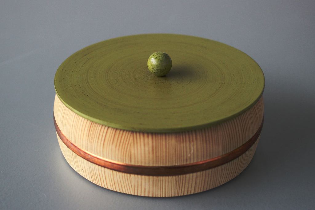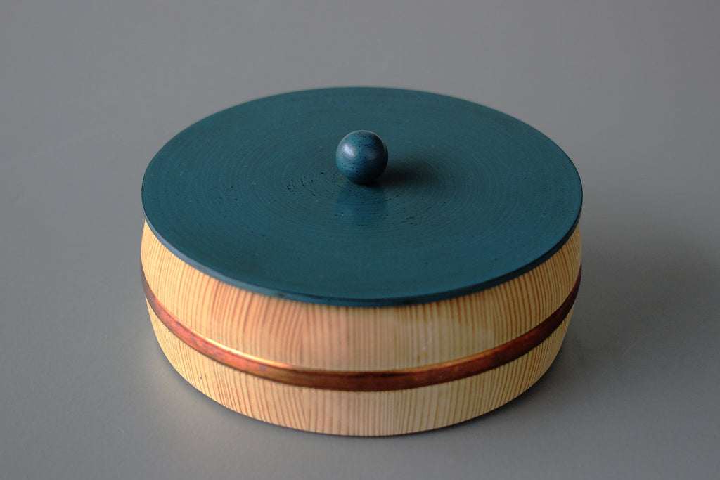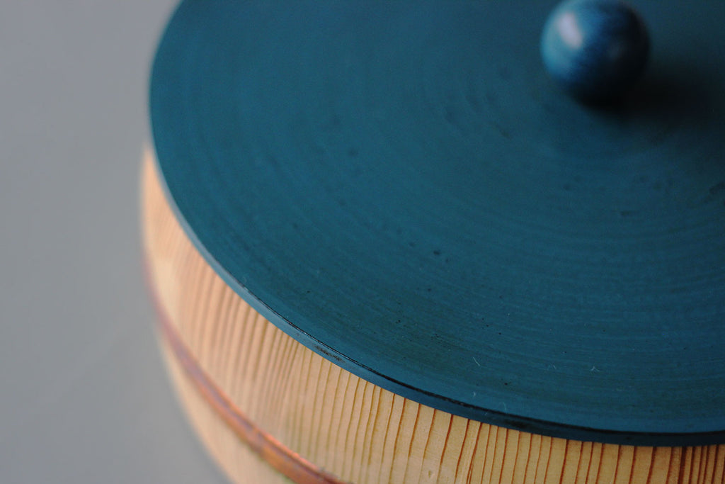まるっこい木桶の器に、こちらも多彩な色使いにまあるい持ち手のついた、漆の蓋がセットされています。姉妹店「さろんぶるー」にで使われています。テーブルに置かれ、蓋を開ける瞬間がたまらなくワクワクする、チャーミングな菓子器が出来ました。