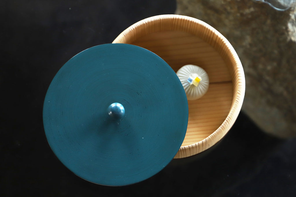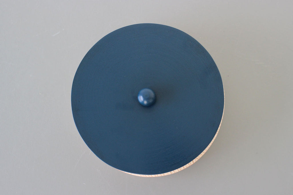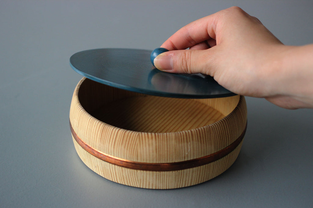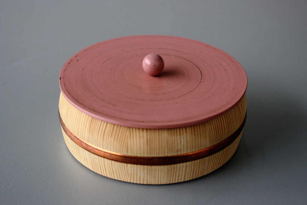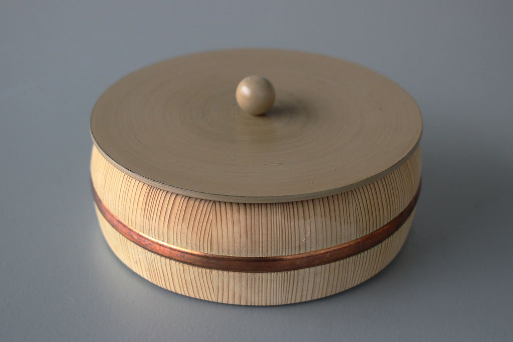 まるっこい木桶の器に、こちらも多彩な色使いにまあるい持ち手のついた、漆の蓋がセットされています。姉妹店「さろんぶるー」にで使われています。テーブルに置かれ、蓋を開ける瞬間がたまらなくワクワクする、チャーミングな菓子器が出来ました。