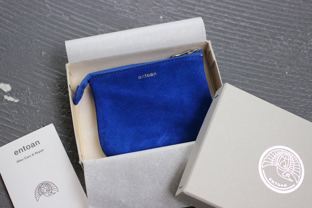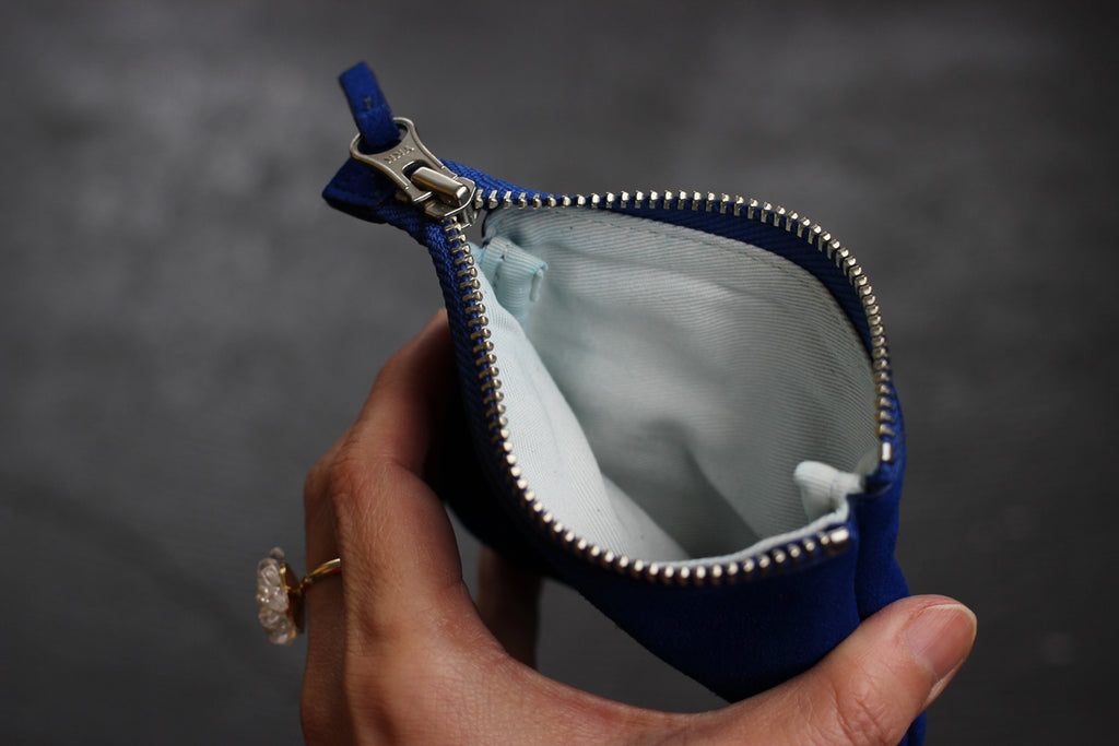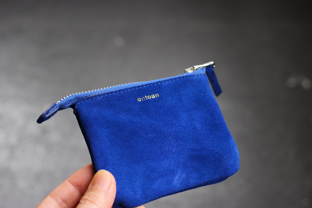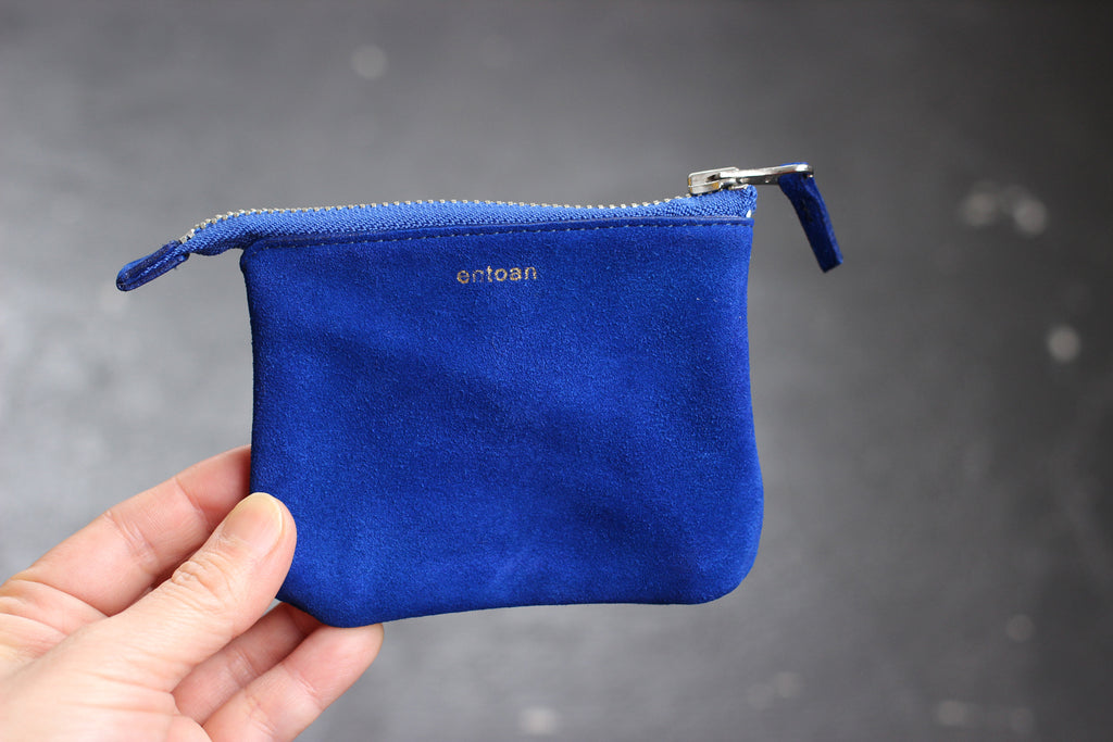 輝くような美しいブルーが目を惹く小さなポーチ。スエード地になっており、触り心地も特別です。クレジットカードが入るので、小銭も入れて小さなお財布代わりにも使っていただけるサイズ感、女性、男性問わず贈り物としてもおすすめです。