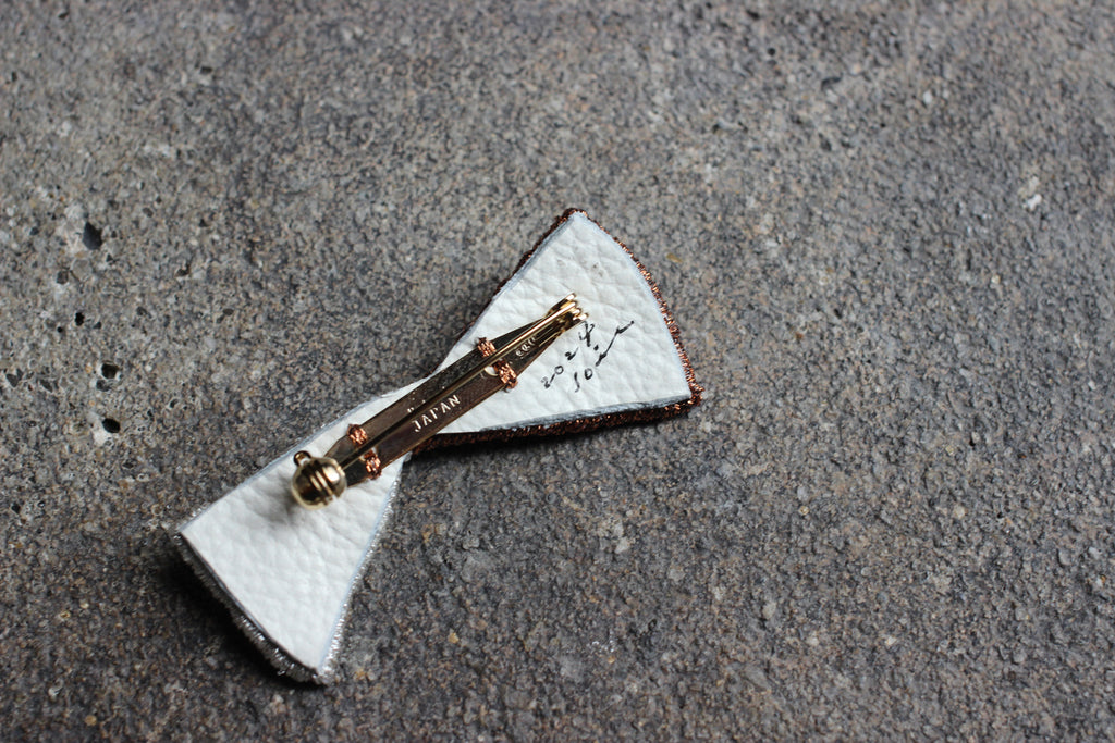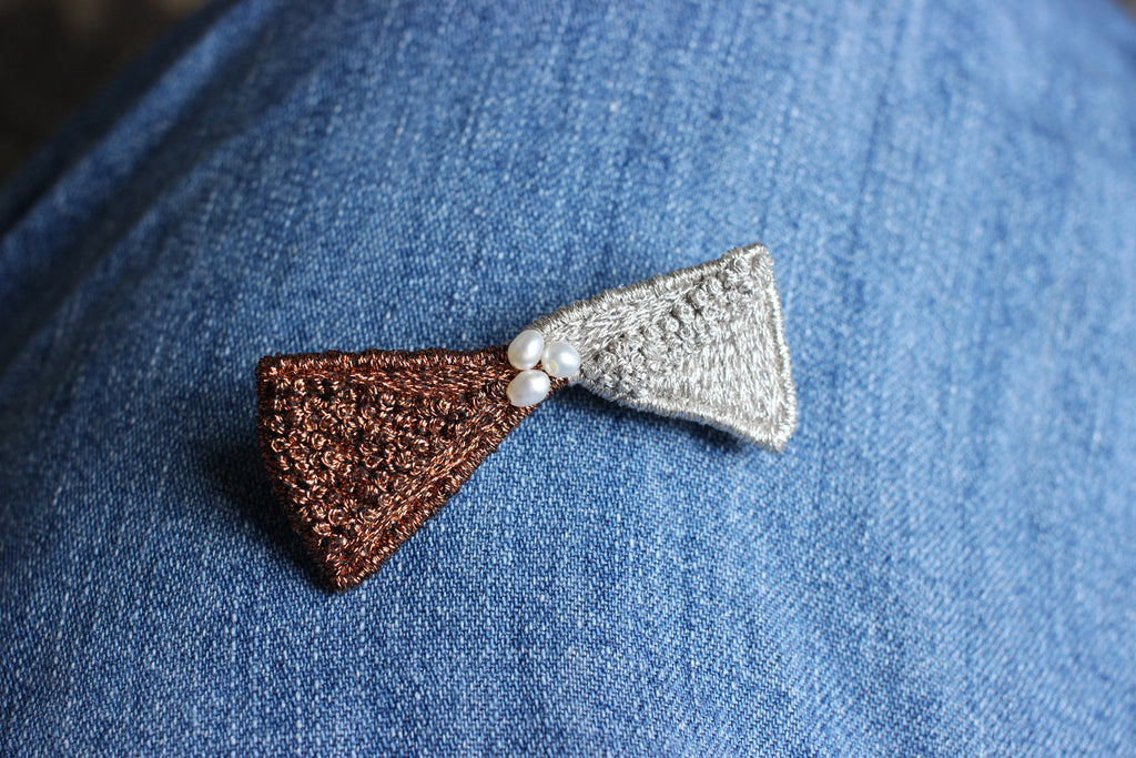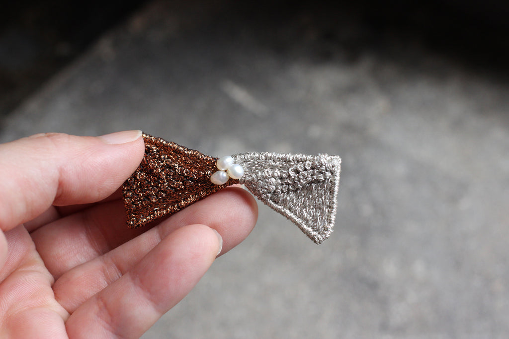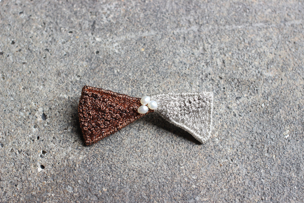 シルバーとブロンズのキラキラした糸を使い中央にはパールをあしらって華やかに。新たなシリーズ「Tiny Born」のリボンブローチです。