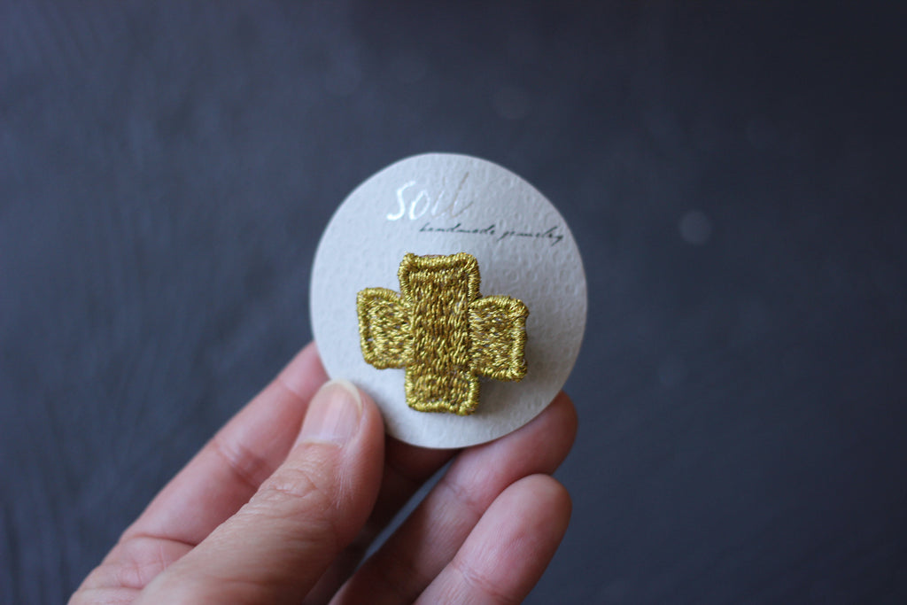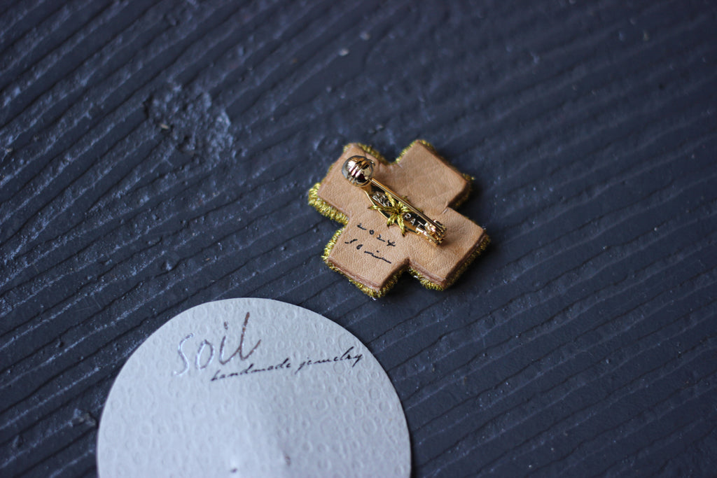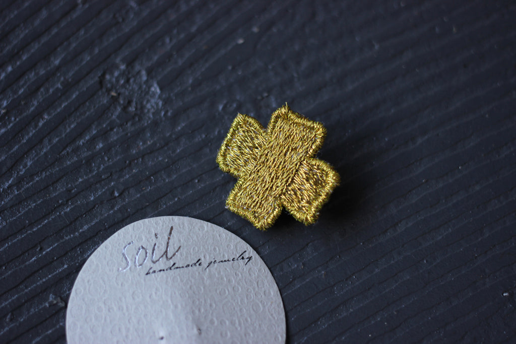 ゴールドに輝くsoilさんのブローチ。定番のカタチながらひとつひとつ手仕事なので異なっています。今回届いたのはカッコ良さの中に女性らしい丸みもある十字架のブローチ。普段使いから特別な日まで暮らしの中に華を持たせてくれるブローチは一つあるととっても重宝します。贈り物にもおすすめです。