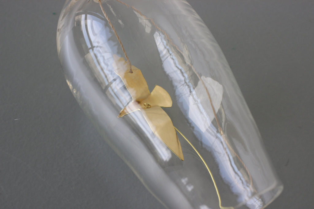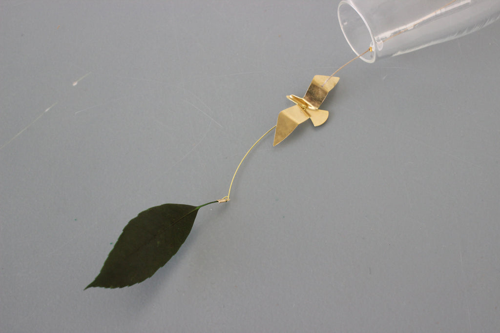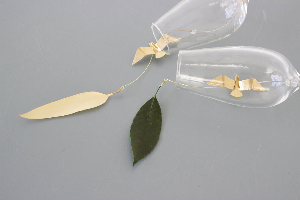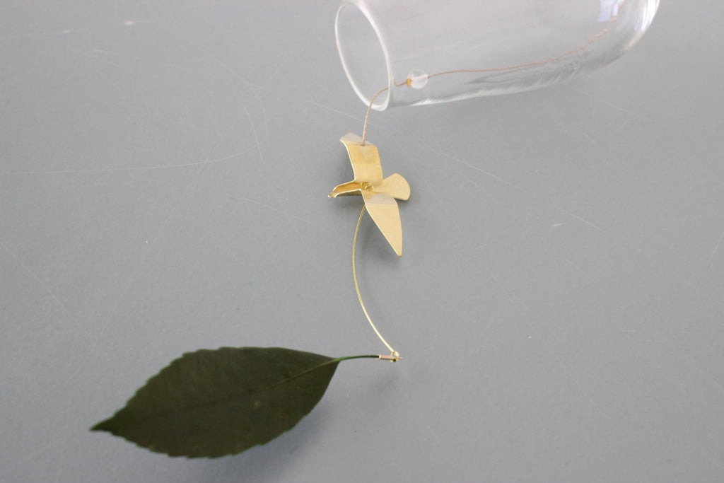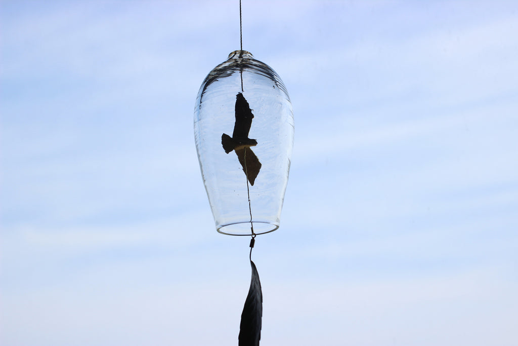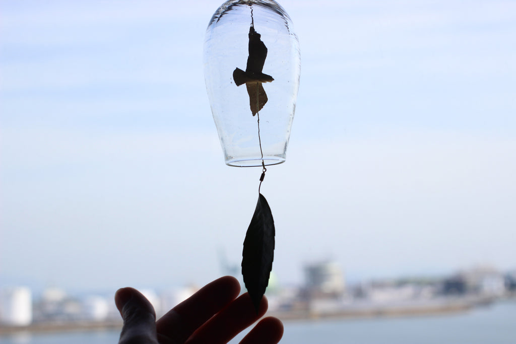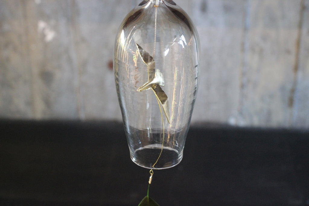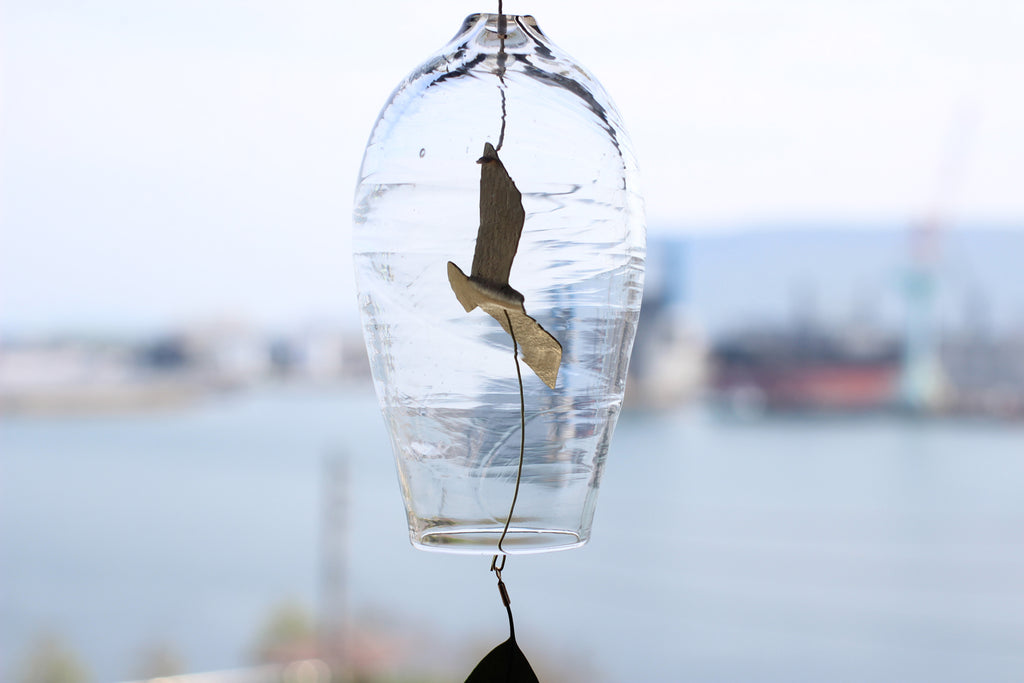 吹きガラスと真鍮の風鈴。 夏のいい音がします。 透明感の高いガラスに 自然のモチーフを付けた風受け、真鍮の舌(音を鳴らすおもり)は金工作家のRenさんの作品です。優雅に飛び回る真鍮のカモメに愛嬌のあるとりもとさんの吹きガラスの風鈴、贈り物にもおすすめです。