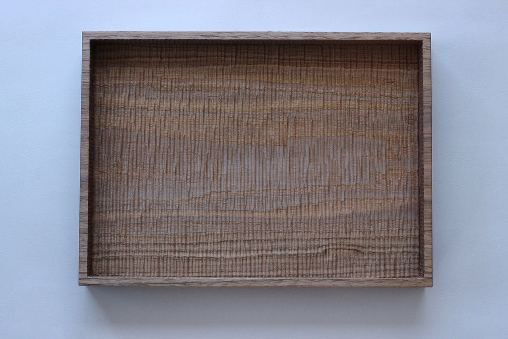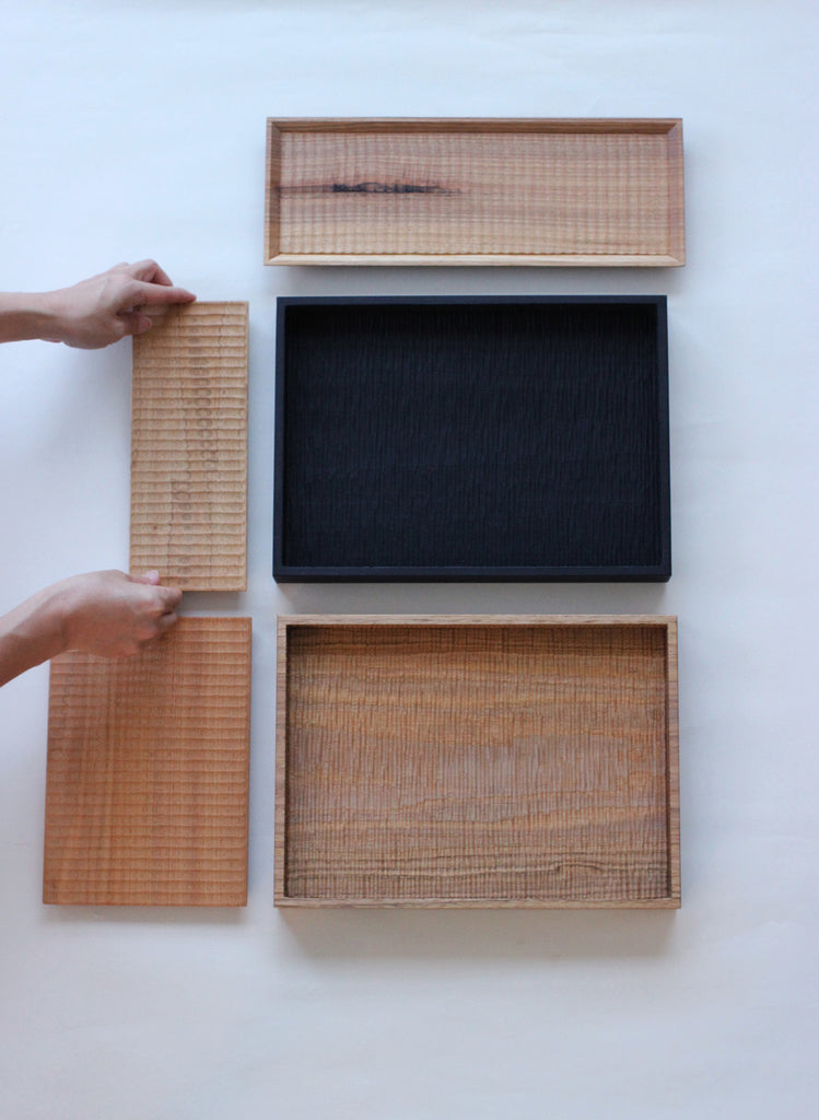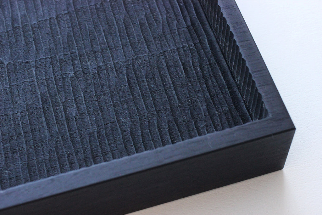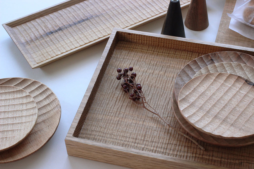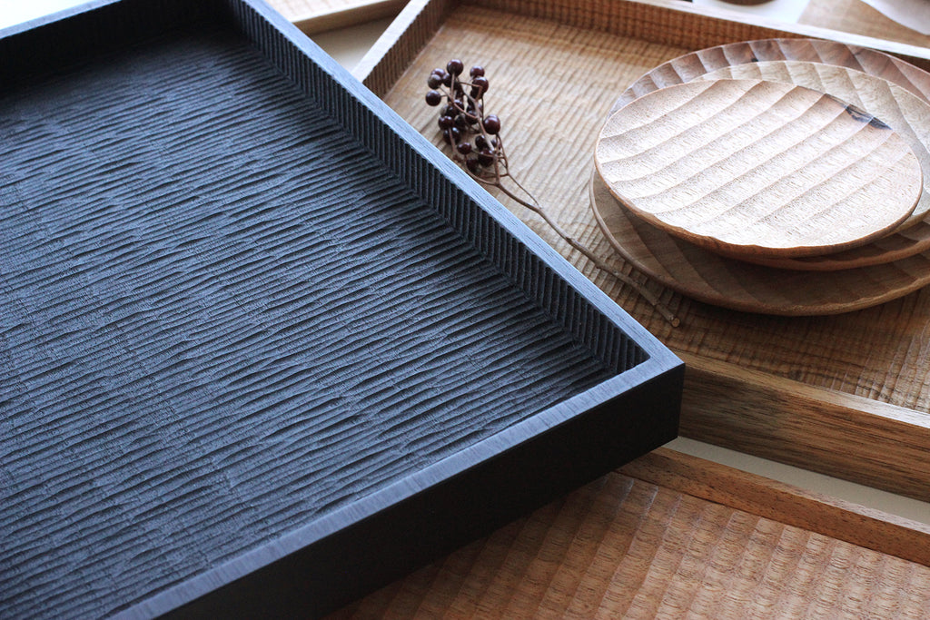 細かな彫りにため息が出るくらい美しいお盆。縁の内側にも刃を入れて細かいところまで仕上げた加賀さんらしさが出てるお盆です。日常の食卓、インテリアとして暮らしの空間にプラスしてもらえるデザインです。和でも洋でも馴染んでくれるので幅広いシーンで使っていただけます。